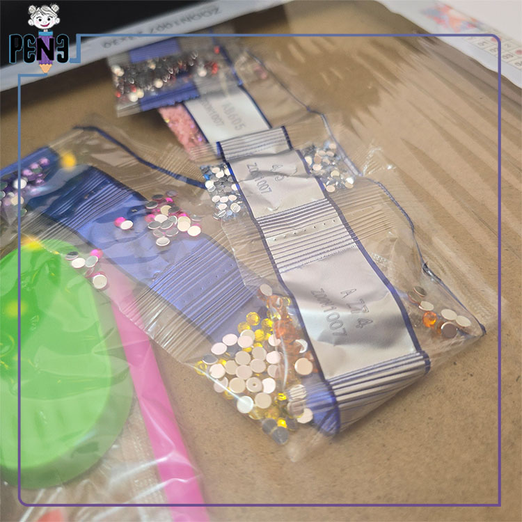- محتویات داخل بسته بندی: قلم مخصوص, الماس های رنگی کریستالی درخشان، ظرف مرتب کردن الماس ها و چسب دوطرفه
