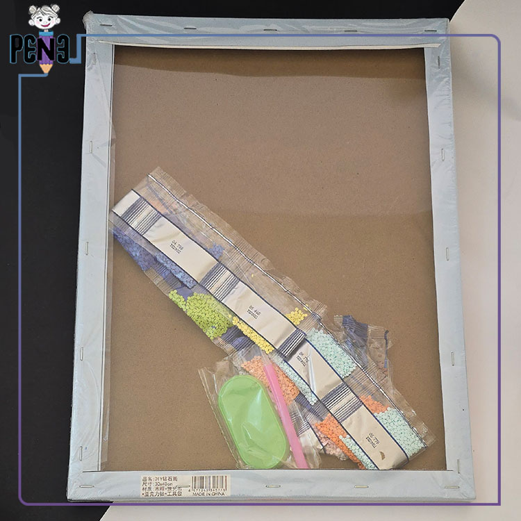 - محتویات داخل بسته بندی: قلم مخصوص, الماس های رنگی، ظرف مرتب کردن الماس ها و چسب دوطرفه
