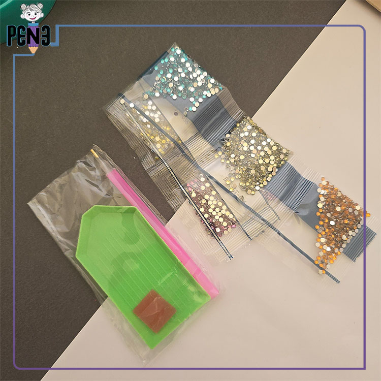 - محتویات داخل بسته بندی: قلم مخصوص, الماس های رنگی کریستالی درخشان، ظرف مرتب کردن الماس ها و چسب دوطرفه