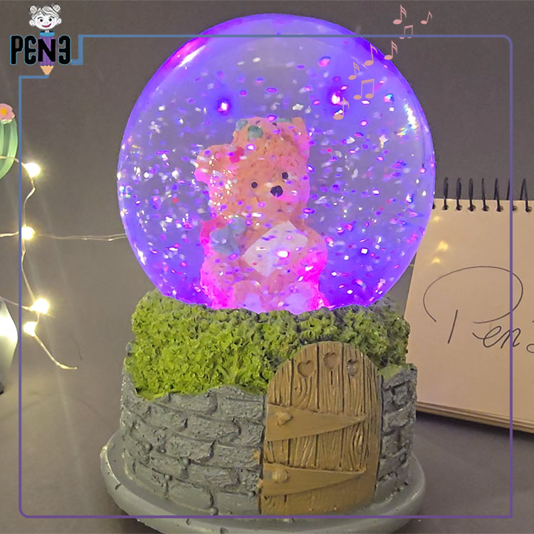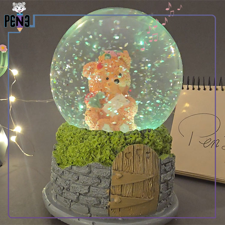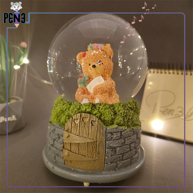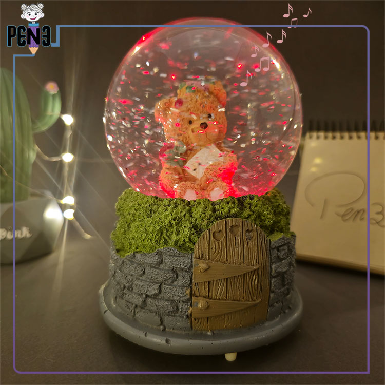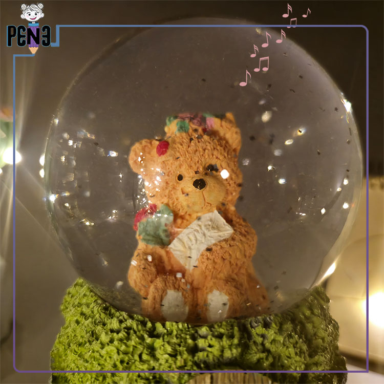 این محصول با طراحی خاص و رنگ نارنجی خرس داخل آن، جلوهای گرم و دلپذیر دارد. این خرس کوچک در دستان خود یک نامه عاشقانه و یک شاخه گل نگه داشته و تداعیگر عشق و احساس است. پایه این گوی از نظر بصری به شکل دیوار سنگی با یک درب چوبی طراحی شده و حس نوستالژی را بهخوبی منتقل میکند. این محصول ۱۶ سانتیمتر ارتفاع و ۱۰ سانتیمتر قطر دارد. با استفاده از ۳ باتری نیمقلمی، هنگام روشن شدن افکت نوری زیبایی بین رنگهای قرمز، سبز و آبی ایجاد میکند. همچنین با پمپاژ اکلیل و پخش یک آهنگ موزیکال کلاسیک، فضای اطراف را رؤیایی میسازد. موزیک داخلی این گوی ثابت بوده و قابلیت تغییر یا اتصال به بلوتوث ندارد.